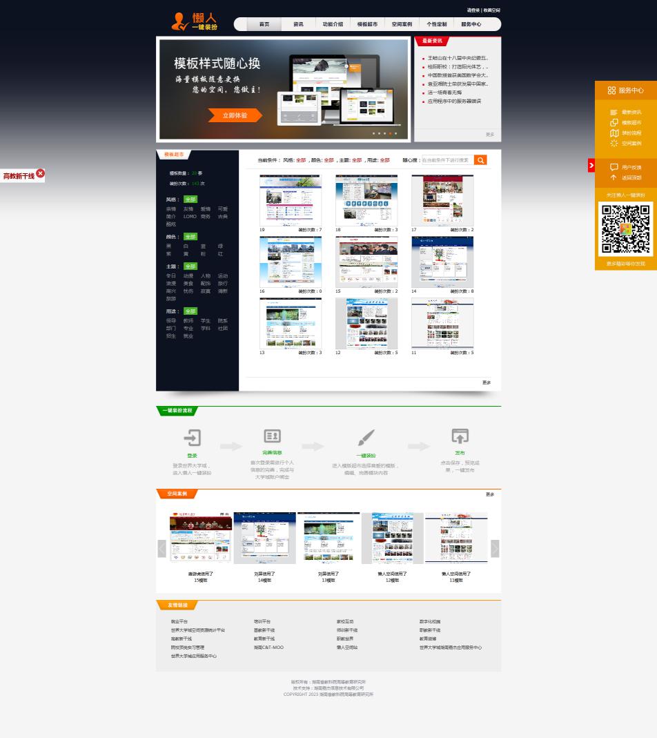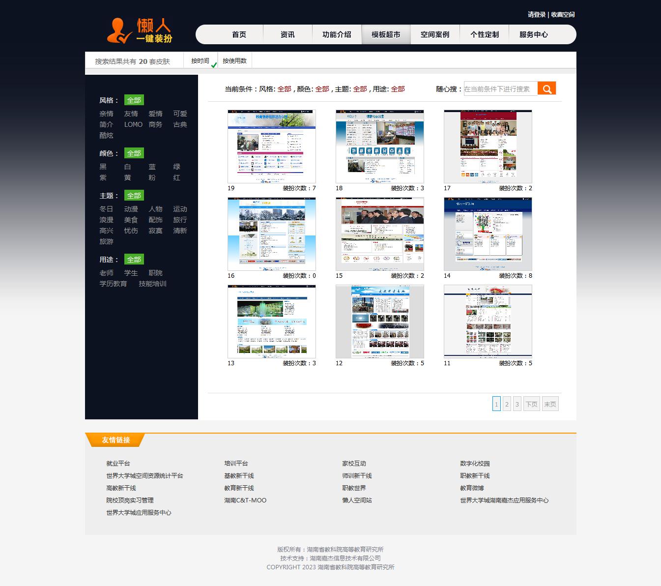 懶人一鍵裝扮系統(tǒng)是為世界大學(xué)城空間量身打造的一款一鍵式建設(shè)及美化工具。該工具為不僅為空間不同角色用戶,如:學(xué)生、老師、領(lǐng)導(dǎo)、職能處室提供了多樣性空間模板選擇,而且可以直接同步空間應(yīng)用功能,使欄目建設(shè)、文章發(fā)布、導(dǎo)航建設(shè)等功能都可以在該工具上一站完成。該工具為用戶提供了一個(gè)無(wú)需了解HTML、CSS、PS等代碼,無(wú)需學(xué)習(xí)計(jì)算機(jī)使用軟件,就可以快速打造一個(gè)美觀實(shí)用的的空間,解決了用戶自主建站耗時(shí)長(zhǎng)、專業(yè)要求高、操作復(fù)雜等問(wèn)題。